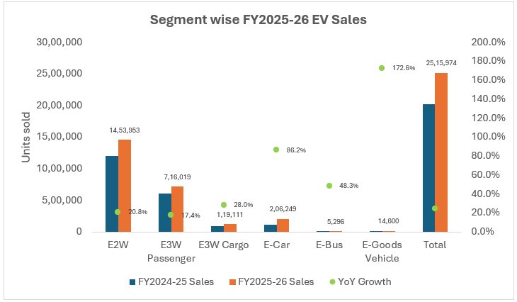 India’s electric vehicle (EV) market delivered another strong year in FY2025-26, with total registrations going past 25 lakhs units, a 24% year-on-year increase. Moreover, EV penetration reached around 8.5% of total registrations, up from 7.7% in the previous financial year. While this indicates that EV adoption continues to strengthen, the market still remains behind the government’s long-term target of 30% EV penetration by 2030.