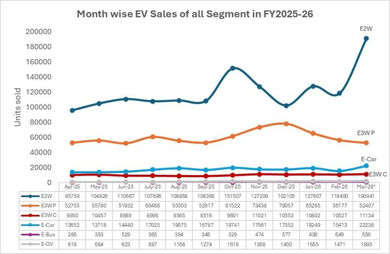 - March 2026 set an all-time record with 2.8 lakh registrations. Several factors contributed to this strong growth, including year-end promotional pricing, concerns around future price increases and high procurement activity from commercial fleet operators. Additionally, many buyers sought to secure benefits under the PM E-Drive scheme before the incentive deadline for e-2W and e-3W.