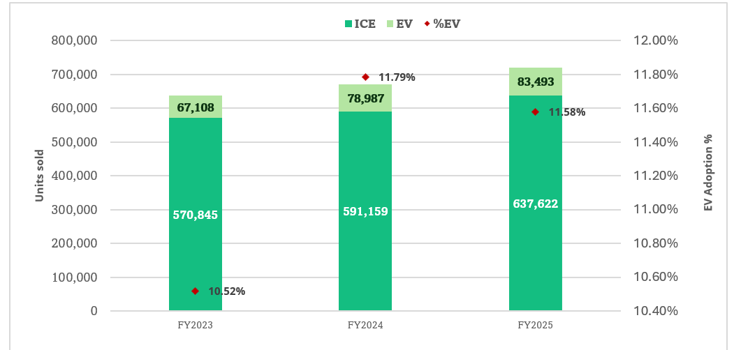 Figure: 1- Delhi’s EV Adoption (FY2023 – FY2025)