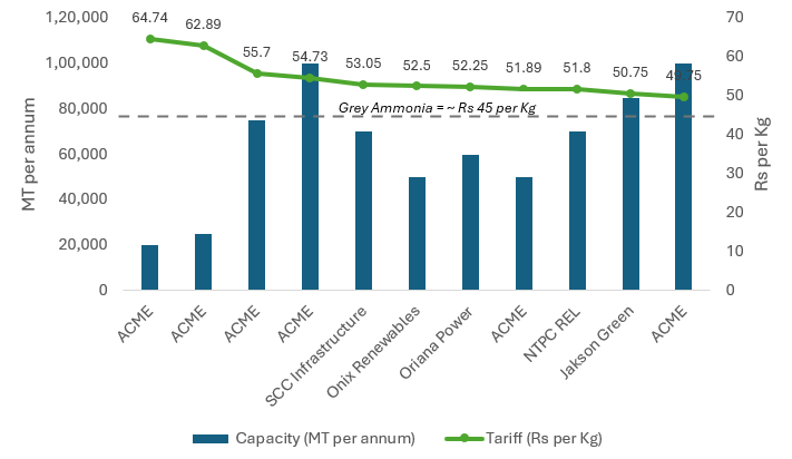 The lowest price discovered so far in the SIGHT Mode 2A auctions is just 10.1% higher than the current grey ammonia prices in India (US$515 per MT). Notably, the low cost of Rs 49.75 per kg in the Mode 2A auctions is almost half of a similar green ammonia auction conducted by H2Global in 2024, suggesting an imminent price parity between grey and green ammonia.