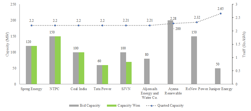 Apart from the 4 L1 bidders, the other project winner, SJVN, which quoted Rs 2.21/kWh (L2 bid) for 100 MW capacity, won 70 MW under the bucket filling method. Other participants included Ayana Renewables , ReNew Power, Aljomaih Energy & Water Company and Juniper Green Energy.