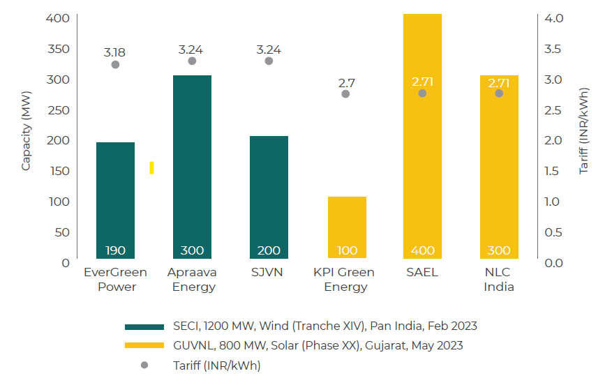 SECI, 1200 MW, Wind (Tranche XIV), Pan India, Feb 2023  120069022%24EverGreen Power (Green Prairie Energy Pvt. Ltd.)- 190 MW (INR- 3.18/kWh)Apraava Energy Private Limited- 300 MW (INR 3.24/kWH)SJVN – 200 MW (INR 3.24/kWh)