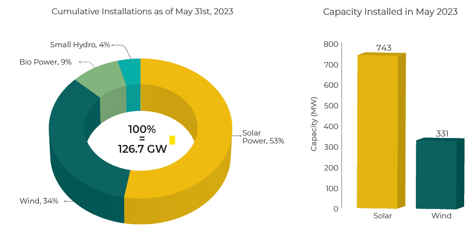In May 2023, a combined total of 1074 MW of solar and wind capacity was added, taking the cumulative RE capacity to 126.7 GW.