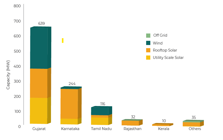 In May 2023, Gujarat installed the maximum solar capacity of 368 MW followed by Karnataka (236 MW), Tamil Nadu (65 MW), Rajasthan (32 MW) and Kerala (10 MW). Gujarat added the maximum wind capacity of 272 MW in the country in May 2023.