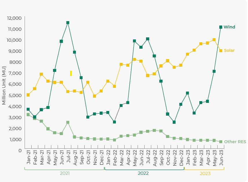 In June 2023, Renewable energy sources generated 20525 MU, which is 16.4% higher than the RE generation in May 2023. Solar generation decreased by 10% while wind generation increased by 57% on month-on-month basis in June 2023.