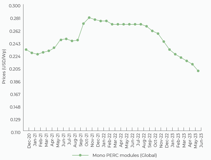 Comparing on m-o-m basis, price for global mono PERC modules have decreased by 4.76% in June 2023.