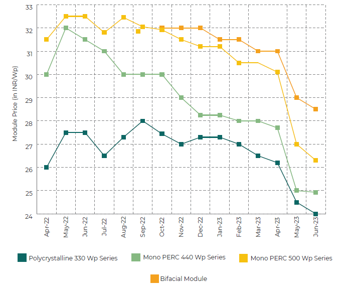 JMK Research carried out price survey from domestic suppliers for June 2023 and as per the responses received, the all-inclusive domestic module prices till project site (including freight charges, GST etc) for various categories are:
