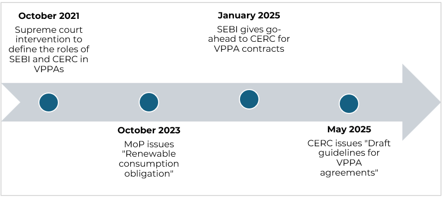 The release of these guidelines follows a decade-long dispute between the Securities and Exchange Board of India (SEBI) and CERC over the regulatory jurisdiction governing VPPA contracts. In January 2025, SEBI stated that the regulatory authority for non-tradable and non-transferable VPPA contracts lies entirely with CERC, which led the Ministry of Power (MoP) to instruct CERC to develop the new VPPA guidelines.