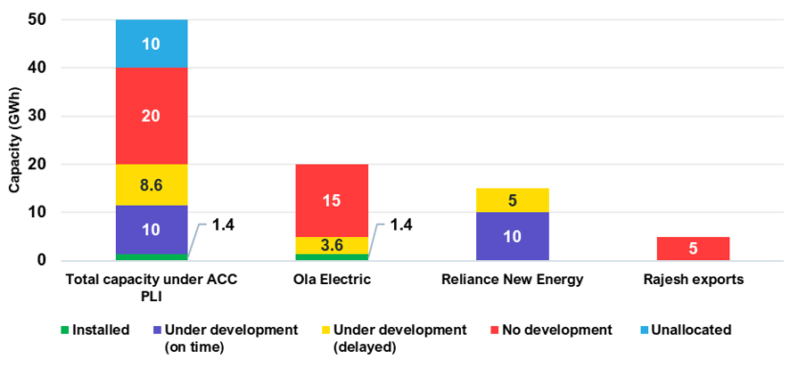 As of October 2025, progress under the ACC PLI scheme has been limited. Only 2.8% (1.4GWh) of the targeted 50GWh capacity has been commissioned within the stipulated timeline, entirely by Ola Electric. However, this 1.4GWh, too, represents only a partial commissioning of Ola Electric’s awarded 20GWh capacity and is yet to meet the DVA requirements needed to qualify for incentive claims. As a result, zero incentives have been disbursed to any beneficiary against the targeted INR29 billion (USD332 million) by October 2025. Ola Electric has also scaled back its expansion plans and now aims to install only 5GWh by financial year (FY) 2029. The other beneficiaries are yet to commission their ACC battery manufacturing facilities. Rajesh Exports lags the most, with progress limited to land acquisition, while reports of financial discrepancies have further raised concerns about its ability to commission the facility in the near term.