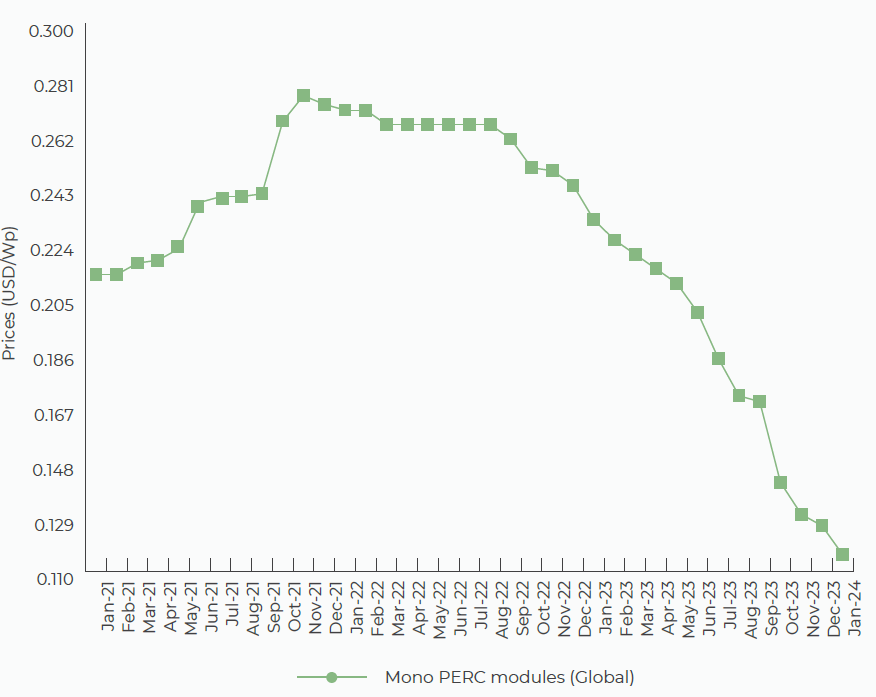 Comparing on m-o-m basis, price for global mono PERC modules have decreased by 7.9% in January 2024.