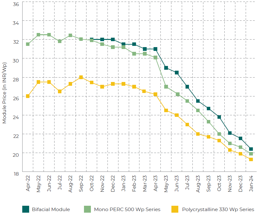 JMK Research carried out price survey from domestic suppliers for January 2024 and as per the responses received, the all-inclusive domestic module prices till project site (including freight charges, GST etc) for various categories are: