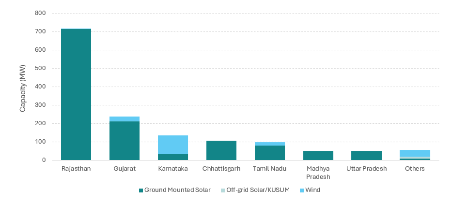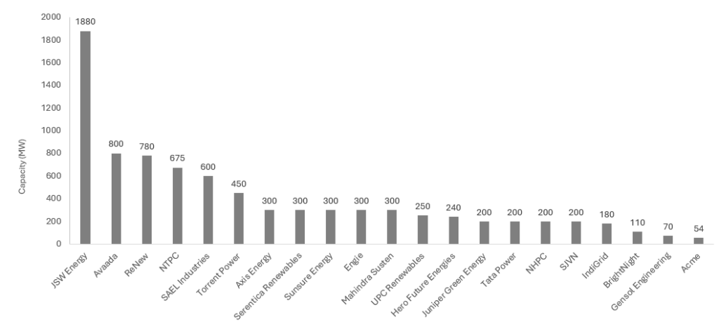 JSW Energy secured the maximum RE capacities of 1880 MW this month, followed by Avaada (800 MW) and ReNew (780 MW).