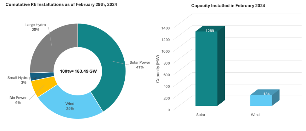 In February 2024, about 1269 MW solar capacity and 184 MW wind capacity was added in the country, taking the cumulative RE capacity to 183.49 GW.