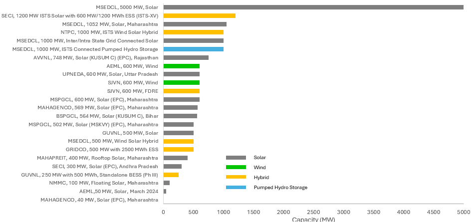 - MSEDCL issued solar tenders with a total capacity of 7502 MW. In addition, MSEDCL invited bids for a 1,000 MW ISTS-connected pumped hydro storage tender and 500 MW for a wind-solar hybrid tender.