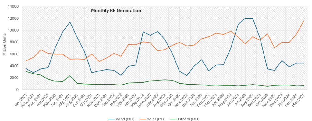In March 2024, about 10,825 MW of RE tenders were auctioned, and 8,389 MW capacities were allotted to various RE developers. Of the total allotted capacity, 5,625 MW were solar capacities, and 2,764 MW were hybrid capacities.