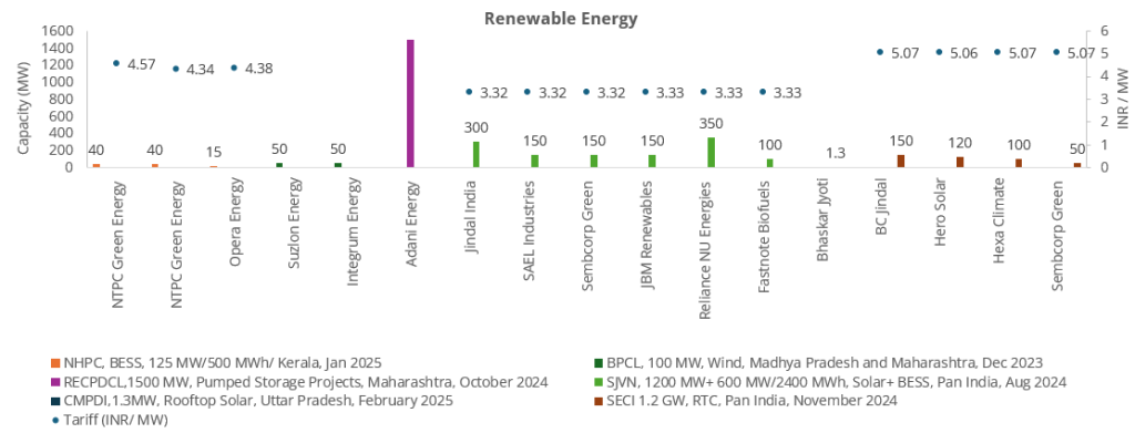 - NHPC’s standalone BESS tender accounted for 5% of the total allotted capacity, while BPCL allotted 100 MW wind to Suzlon and Integrum Energy.
