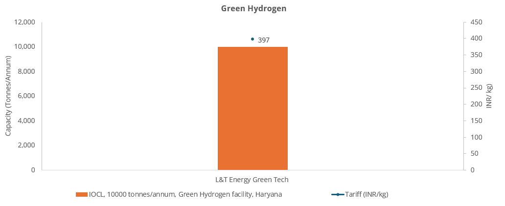 | IOCL, 10000 tonnes/annum, Green Hydrogen facility, Haryana | Green Hydrogen | 10,000 tones/annum | 10,000 tones/annum | L&T Energy Green Tech –INR 397/kg | |||||