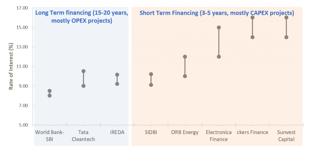 Short term financing options are usually for a tenor of up to 5-7 years, and are mostly availed either by MSMEs or by corporates who could not avail loans from the abovementioned route. Major lenders in this space are SIDBI and Orb Energy.