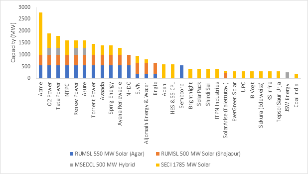 In this auction, Acme Solar is the lowest bidder who has won 300 MW capacity at a tariff of Rs 2.42/kWh, while Renew Power has won 200 MW capacity at a tariff of Rs 2.43/kWh. This is Acme’s second win in the last 6 months. The first one was a 90 MW capacity won in SECI 1200 MW Hybrid ISTS-Tranche III, Jan 2020 tender.
